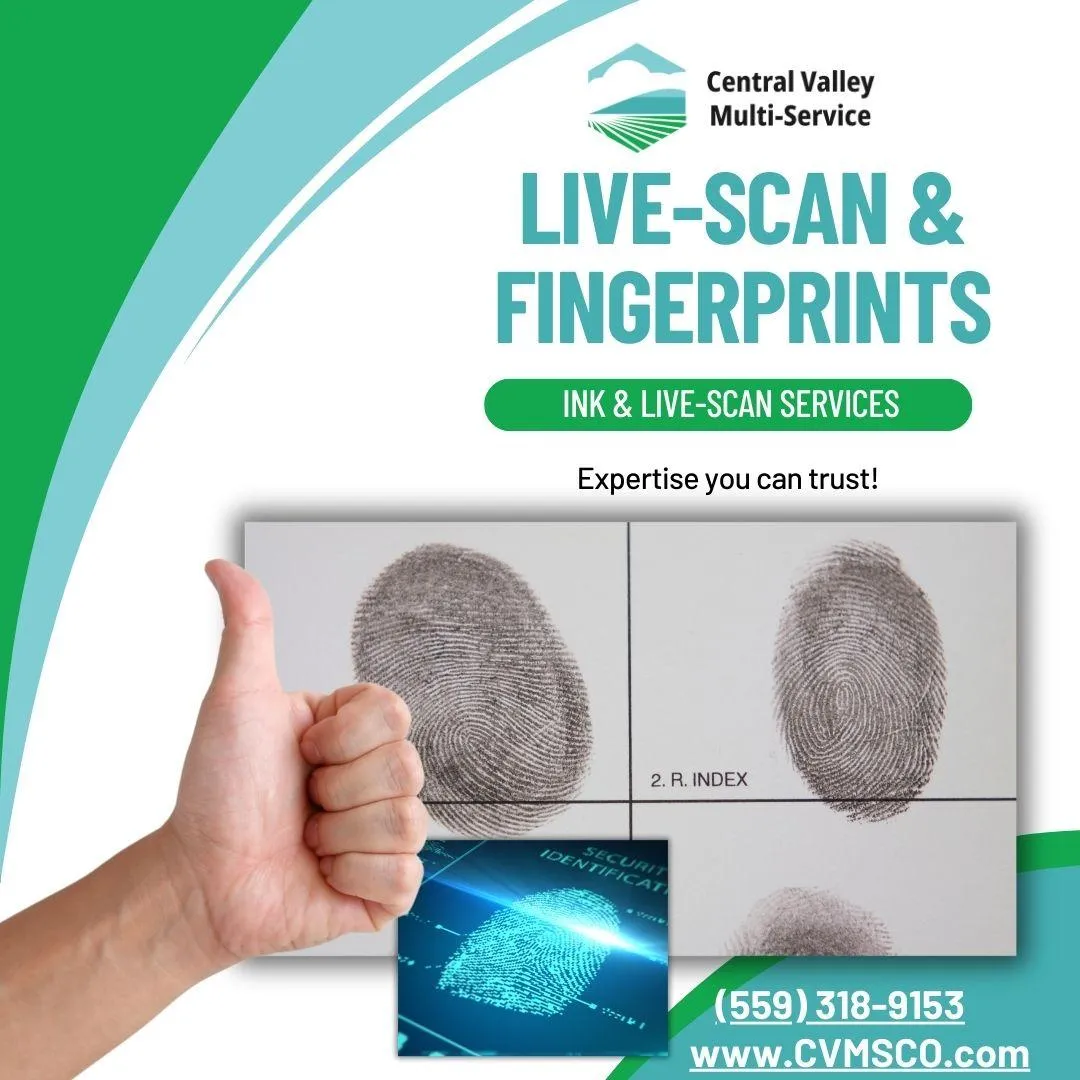 Central Valley Multi-Service (CVMS) offers expert LiveScan and ink fingerprinting services for individuals and businesses. Our skilled team ensures accurate, reliable fingerprinting that meets all legal and regulatory standards. Whether it’s for employment, licensing, or background checks, we deliver precise results using advanced technology—fast and hassle-free.
